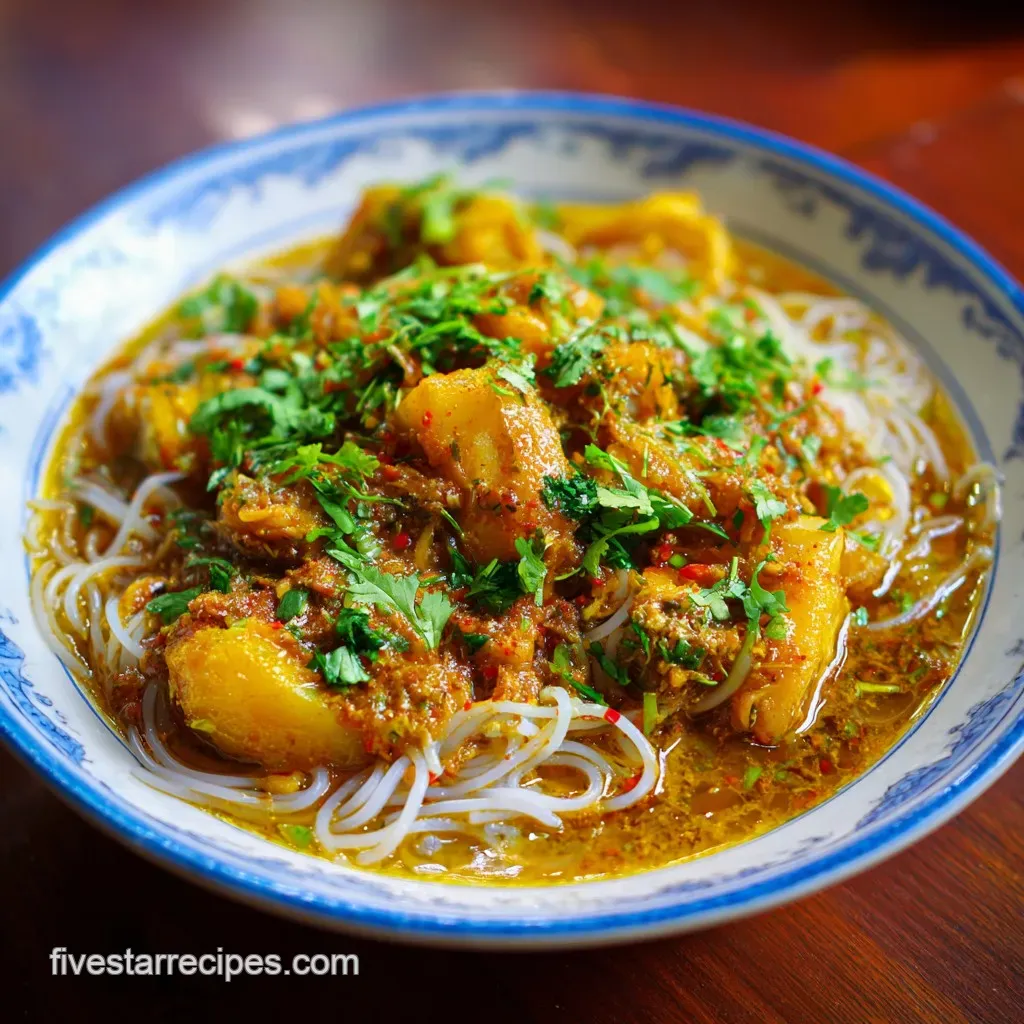 The core ingredients include: Fish (usually catfish), rice noodles, chickpea flour for thickening, rice powder, and a strong aromatic base of lemongrass, ginger, garlic, and shallots.